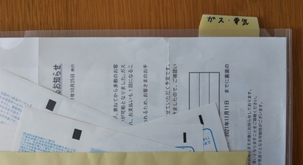 写真の「ガス・電気」をはじめ、「水道」「生命保険」「火災保険」「クレジット」「役所関係」「地域・自治会」「病院」「年金」等々の定例的な項目のほか、個別の関係先ごとのファイルをつくってあります(このクリアファイルに貼った見出しは、無印良品の製品で、薄いプラスチックでできたポストイット状のもの)。
