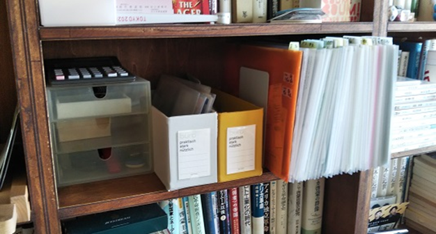 こちらの写真は、バインダーなどのある、書斎の本棚の様子です。