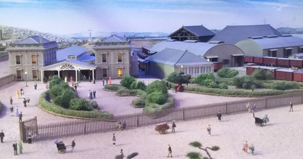 最初の鉄道が開業した当時の横浜駅(上記の機関車とともに展示されているジオラマ)